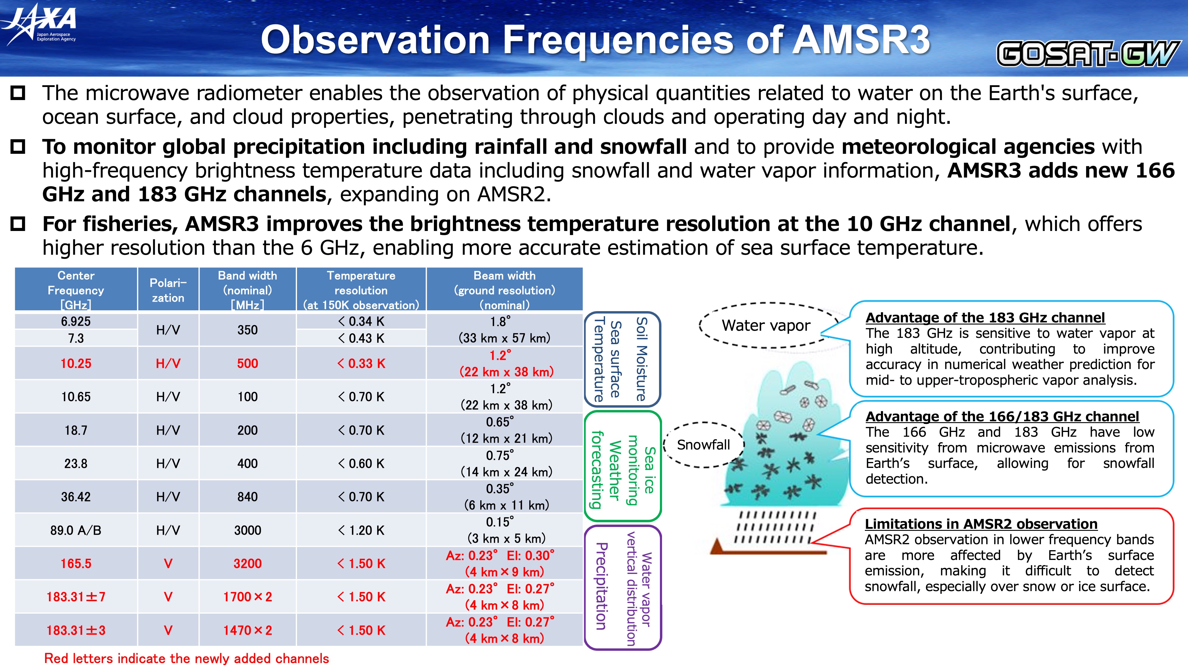 Reference: JAXA Satellite Navigator’s “IBUKI GW” (GOSAT-GW) web site“AMSR3 will provide further continuous observation of water-related information and will have new observation channels”