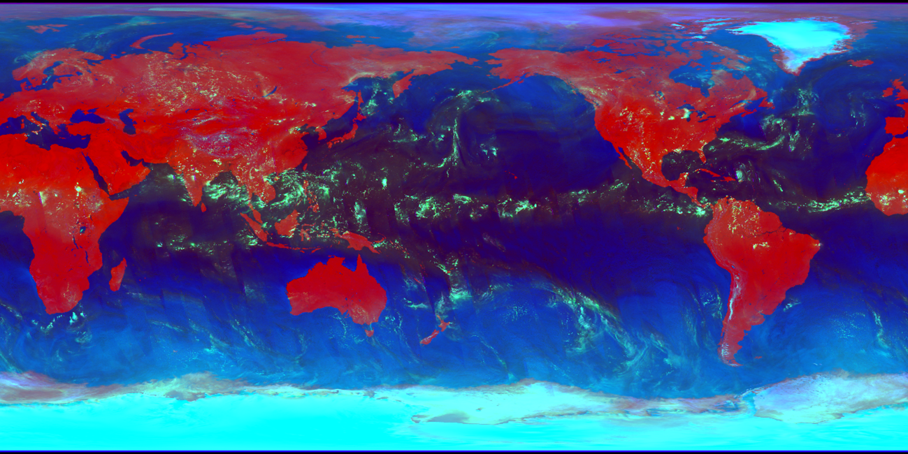 Figure 2:AMSR3 global observation image highlighting cloud and precipitation areas in light green (RGB composite image using 18.7, 89.0, and 165,5 GHz V-Pol. brightness temperature averaging data of ascending paths*6 from August 15 to 17, 2025)