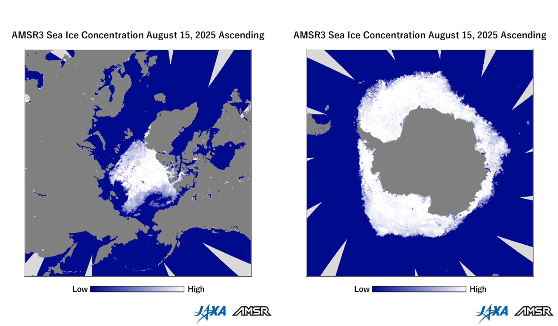 Figure 6: Sea ice observation over polar regions by AMSR3 (ascending paths on August 16, 2025. Left: Arctic sea ice distribution centered on the North Pole. Right: Antarctic sea ice distribution centered on the South Pole.)