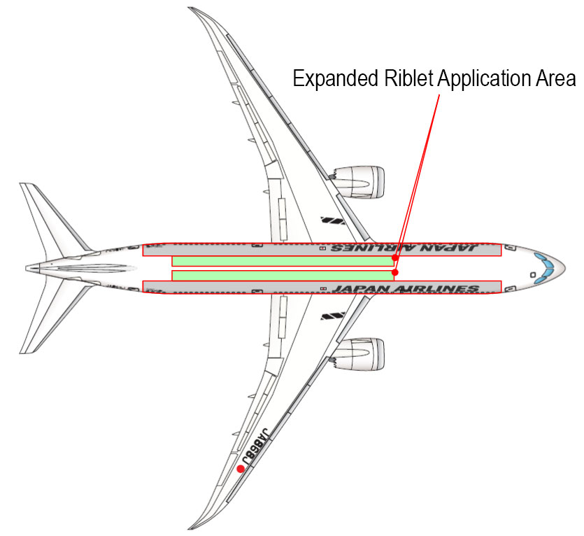 - *1 Riblet: Fine groove structure inspired by the shape of shark skin, which reduces water resistance. By forming a finegroove structure on the aircraft's exterior panel along the air flow during flight, drag can be reduced.